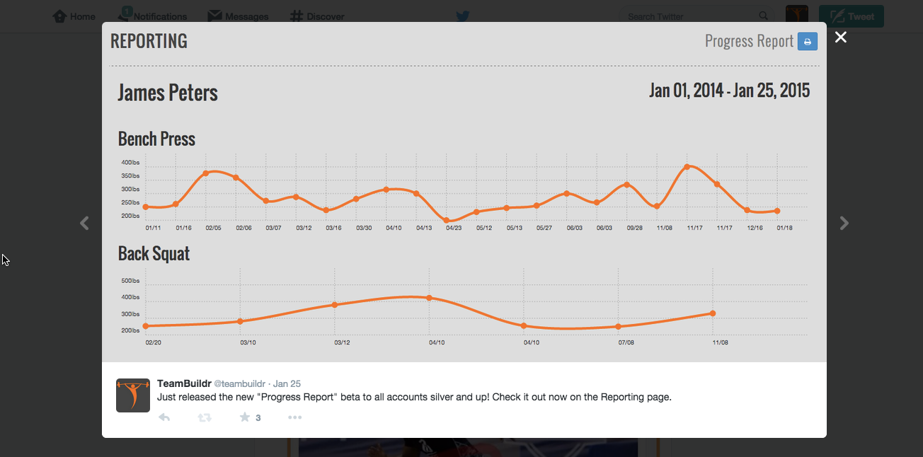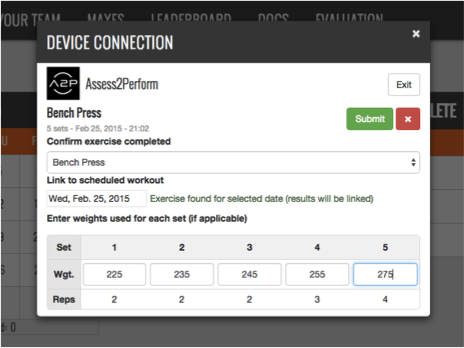 Assigned weight per set is generated automatically based on percentages and max in TeamBuildr -- or an athlete or coach can insert it into the tablet. Athlete data (including rep-by-rep data generated by A2P) can be spot-checked or formatted into charted reports for evaluation.